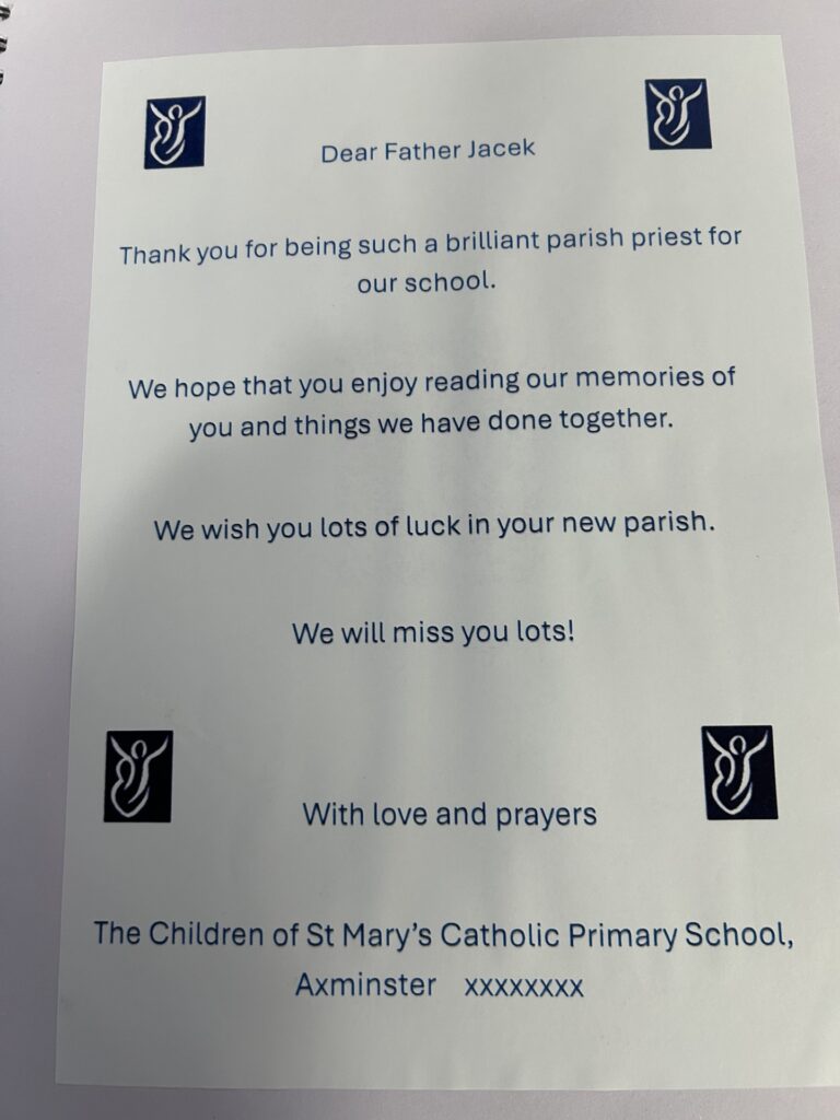 On Sunday 18 January we gathered at St Mary’s to bid farewell to Fr Jacek and to thank him for his ministry in our parish before his departure to Truro. Richard Salt gave a heartfelt speech and presented Father with his gift of a Marian chasuble (currently being made to order) and a cheque for the balance of the parish collection for him. The chasuble will have an inscription embroidered on the inside ‘To Fr Jacek, with gratitude for your ministry to the Most Holy Trinity Parish, Axminster, Seaton and Lyme Regis’. Please keep Fr Jacek in your prayers and also Fr James, our new Parish Priest.